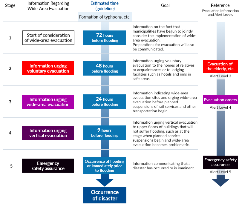 Figure-2 shows the "Wide-Area Evacuation Timeline" that will be implemented if there is a possibility of large-scale flooding in the Tokyo metropolitan area. It is applied based on forecasts of atmospheric pressure, wind speed, rainfall, and other factors, as well as decisions made by local governments.