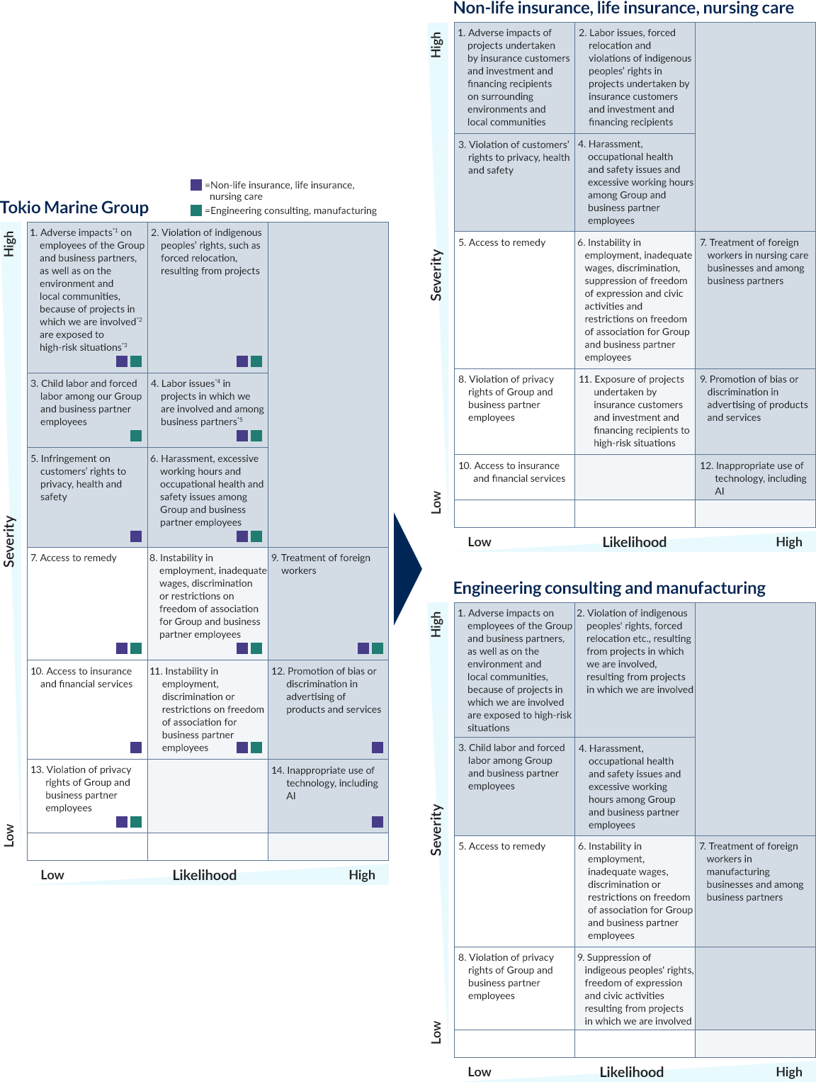 | Prioritization of issues | Severity was plotted on the vertical axis and likelihood on the horizontal axis to map human rights issues that are particularly significant for Tokio Marine Group. |