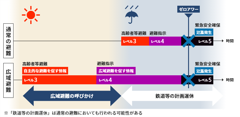 安全に避難するためには早期に避難を開始する必要があります。図-2は通常の避難と広域避難のタイミングの違いを表したものです。場合によってはまだ晴れているうちから避難する必要がありますが、仕事や学校など予定もある中で、それほど簡単ではありません。また、気象予測の精度には限界がありますので、早めに避難を開始すればそれだけ空振りの可能性も高まります。
