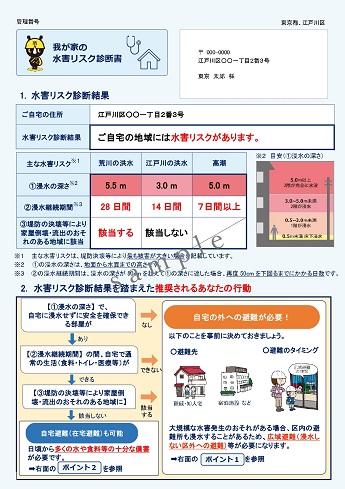 図-1は、2023年に東京都が江東5区の一部地域の住民に送付した「我が家の水害リスク診断書」のサンプルです。自分の避難先を決定するには、まず自宅の水害リスクを確認します。ポイントは浸水の深さ、浸水継続期間です。浸水が深い場合は自宅外への避難が必要になります。浸水継続期間が長く、前編でお示しした過酷な避難生活に耐えられそうにない場合も、自宅外への避難が必要になります。また、河川の近くなど、氾濫が発生した場合に危険な地域もやはり自宅外への避難が必要になります。そして、自宅外への避難が必要な住民は、広域避難であっても江東5区内の避難であっても、行政が用意する避難所ではなく、自分で避難場所を確保する必要があります。具体的には、浸水しない場所にある、親戚宅、友人宅、ホテル、勤務先等です。