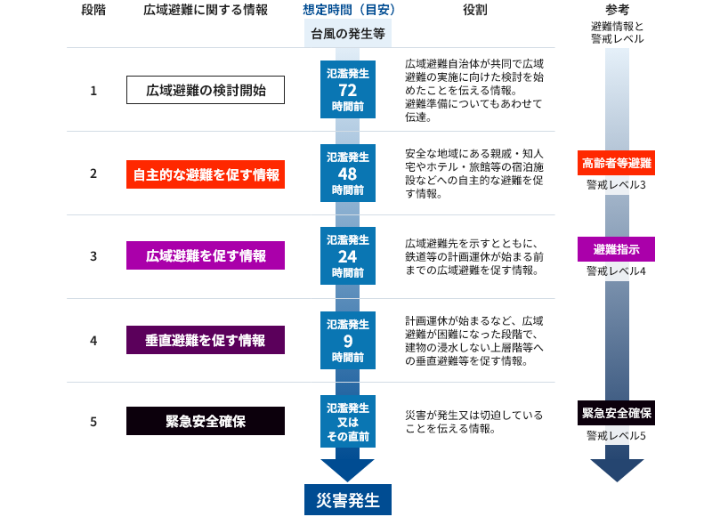 これによれば、避難に時間のかかる広域避難の場合は、遅くとも、氾濫が予想される24時間前に「広域避難を促す情報」発表されたら避難を開始する必要があります。ただし、広域避難者が一斉に避難を開始すると、混雑でスムーズに避難できない可能性がありますし、公共交通機関が計画運休を行う可能性もあります。このため、72時間前に「広域避難の検討開始」が発表されたら、情報収集をこまめに行い、余裕をもって避難を開始する必要があります。江東5区内や居住区内での避難の場合でも、混雑を想定しておく必要があります。