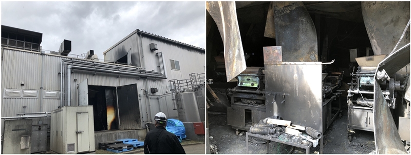 1回目の火災事故が起こったのは2017年2月下旬の深夜でした。製造工程で使用していたガスフライヤーから出火し、ダクトに火が回ったことで工場全体に燃え広がりました。