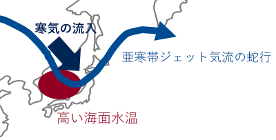 この時の気象状況としては、亜寒帯ジェット気流が極東域で蛇行し、北極近くの寒冷な大気が日本付近に流れ込みやすい状況になっていました。また、日本海の海面水温が平年よりも高い状態になっていました。これらの状況はまさに前述のプロセスと重なっています。