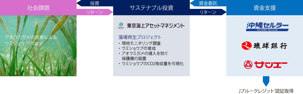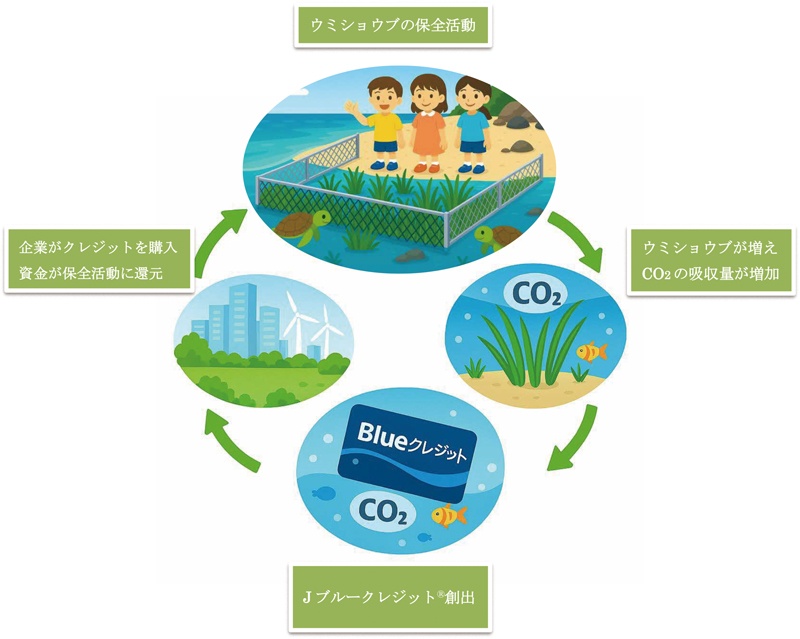 この状況を改善すべく、東京海上アセットマネジメントは沖縄に拠点を持つ企業などに協力を呼びかけ、ウミショウブの藻場再生プロジェクトを始動。ウミショウブによるCO2吸収の価値創出とビジネス化を支援し、2026年1月には、このプロジェクトを通じて吸収したCO2が「Jブルークレジット」*1に認証されました。